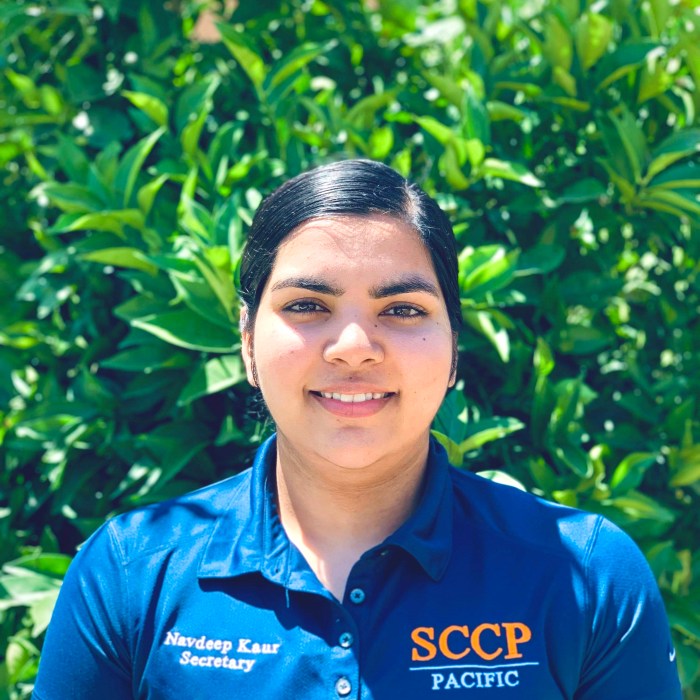 My name is Navdeep Kaur and I am the secretary for SCCP here at UOP. I chose to be a part of this organization because I was always interested in clinical pharmacy and this organization has increased my interest. I have been attending various meetings where I got to learn more about what clinical pharmacy is actually like. During my free time, I like to cook different recipes with my family and spend time with them outdoors.