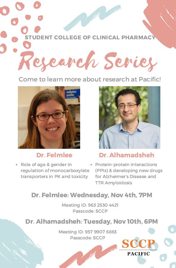 In replacement of annual research symposium, SCCP-Pacific introduced a new research series featuring two faculty members, Dr. Felmlee and Dr. Alhamadsheh. They went over their research interests and opportunities available at Pacific for students who were interested in getting involved in research.
